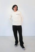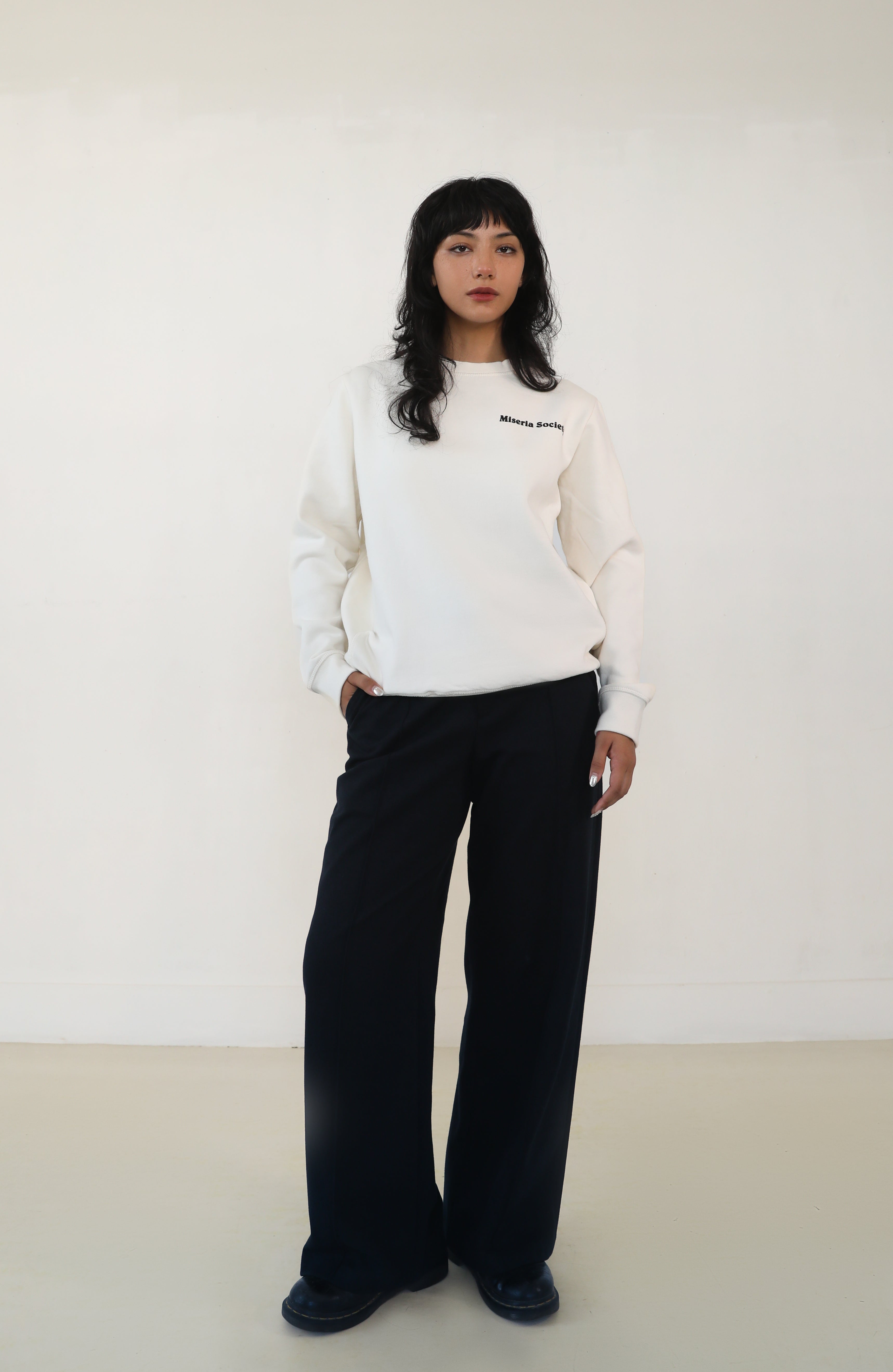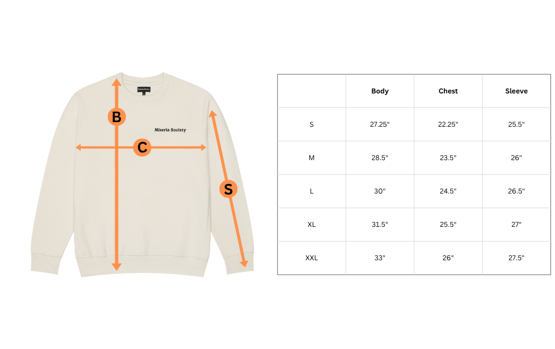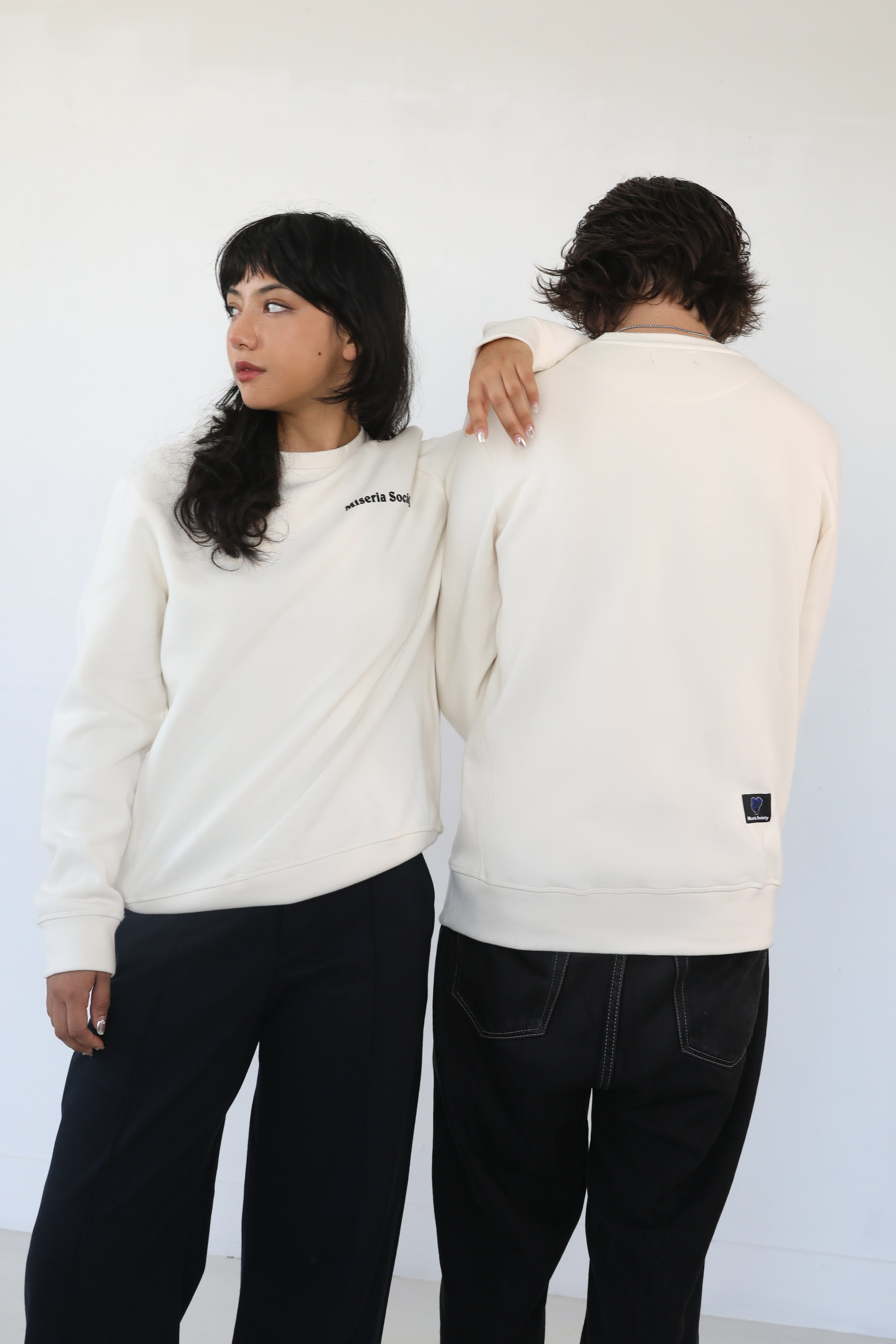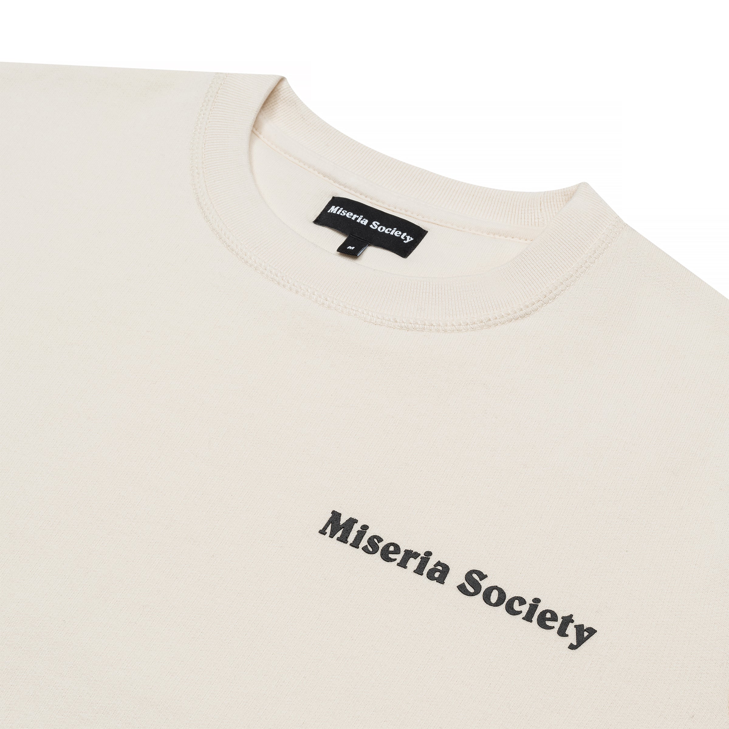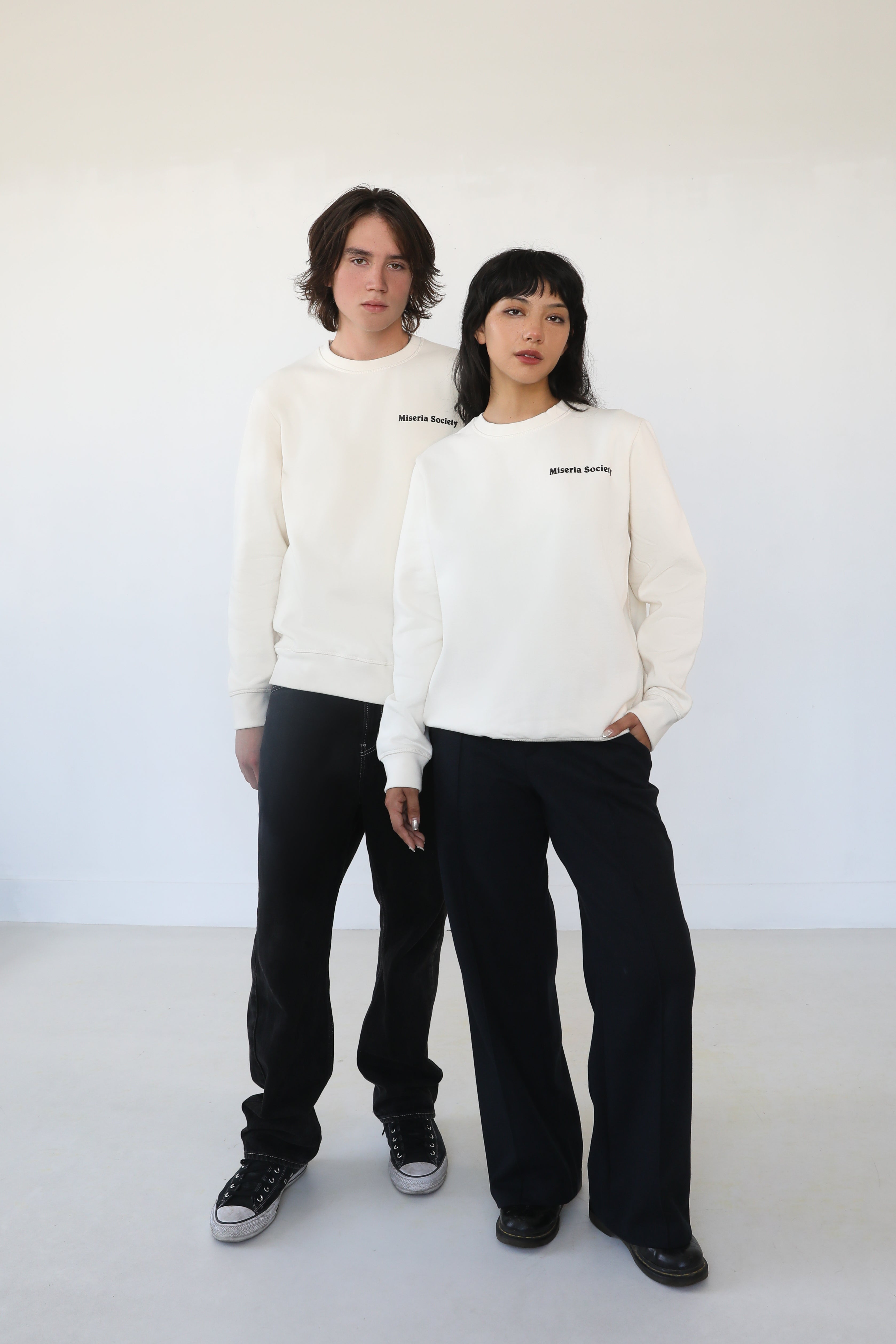 Made from an ultra-soft 80/20 organic cotton and recycled polyester blend with a heavyweight 400gsm fleece, this crewneck delivers comfort, structure, and a unisex fit. Reverse flatlock stitching and wide ribbed side panels add durability and flexibility. Finished with a high-density ink "Miseria Society" screen print and our signature woven label on the back hem.